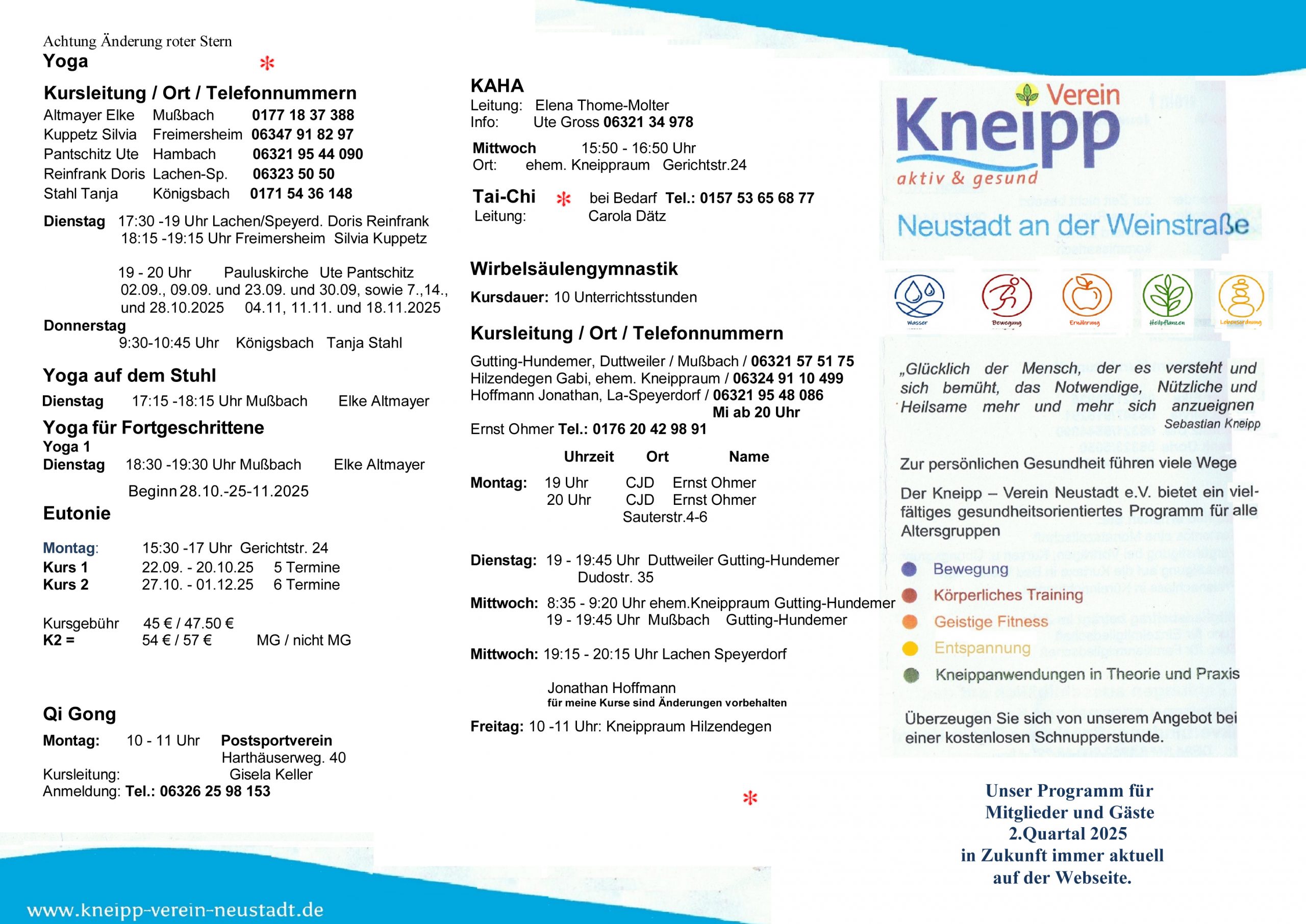 Am 08. Juni 1951 wurde der Kneipp – Verein Neustadt gegründet. Der Verein wird ehrenamtlich geführt, dient ausschließlich gemeinnützigen Zwecken, ist überparteilich, ist Mitglied im Kneipp-Bund e.V. Landesverband Rheinland-Pfalz und im Kneipp – Bund e.V. Bundesverband für Gesundheitsförderung und Prävention.